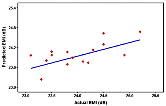 A scatter plot (Figure 7) is a graphic or mathematical diagram that uses Cartesian coordinates to display values for two variables for data collection. Figure 7 indicates the contrast between the real value on the X-axis and projected EMI values on the Y-axis. As seen in Figure 7, there is a linear connection between the expected and real values of EMI. This underpins the significance of the regression equation derived from the analysis of variance in determining the best range of various particles to utilize for reinforcement to get the highest EMI.