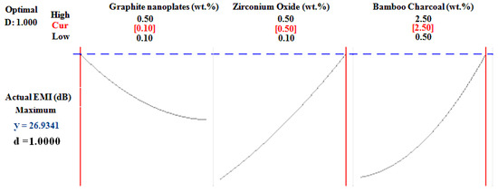Table 9 and Figure 8 represent the optimal weight percent of GNP, ZrO2, and BC for the best EMI value through the RSM optimization study. It shows that the combination of 0.1 weight percent GNP, 0.5 weight percent ZrO2, and 2.5 weight percent BC provides the highest EMI SE data, i.e., 28.61 dB, with a desirability value of 1.