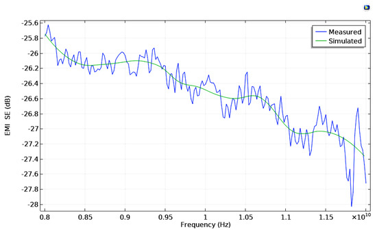 The distance between ports was 42 cm. The imported simplified foam model was placed between Port 1 and Port 2. The electric mode field amplitude in Port 1 was configured following the relation, and their values are permittivity = 1.126 × 10−11 F/m, permeability = 1.257 × 10−6 H/m, and electrical conductivity = 3.588 × 10−14 S/m, where the waveguide width parameter is equal to 2.5 cm. The elevation angle of incidence is 0, which means the electric field is normal to the geometry surface. The mathematical equation for component y of the electric mode field amplitude matches the spatial propagation behavior exhibited by a classic pyramidal horn antenna. The material chosen for the polymeric foam was (built-in) polyurethane, and the domain outside and inside (the bubbles of) the cellular structure was filled with air. The electric and magnetic material properties are required to solve the governing equations of the mathematical model. The frequencies analyzed (parametric sweep) went from 8 GHz to 12 GHz, with a 500 MHz interval between computed values. The norm of the electric field and power flow at 10 GHz are shown in Figure 10, respectively. Finally, the shielding effectiveness values were computed for each frequency analyzed for the physical model-simulated and the flexible bio-based PU foam. These scenarios are summarized in frequency spectra, as shown in Figure 11. The results carry a relative error of 2.48% between the EMI SE of the manufactured material, which peaked at 28.03 dB, while the maximum value reached for the simulated model is near 27.35 dB.