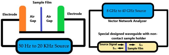 A newly designed sample holder and microwave waveguide were employed with an air-gap capacitor and vector network analyzer. The whole measurement was based on the electromagnetic field and microwave signal analysis. There was no physical contact between signal source electrodes and sample film surface during the test. The result measured by these non-contact methods is much more accurate because the contact impedance and weak contact error could be totally avoided. Furthermore, there are no chemical reactions between materials of electrolytes and electrodes.