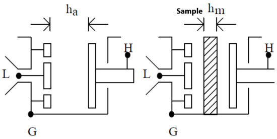 In practical measurements, the electrodes are normally pressed by clamping on the electrolyte sample to avoid a weak contact problem, however, the contact problem can not be totally avoided. In our non-contact measurement process, we prepared the specimen with a designed thickness for further accurate characterization. The average thickness of sample hm would be measured by placing the specimen in some different positions, as shown in Figure 5. During the test, the space between electrodes would be set to 100 to 200 um longer than the thickness of the sample, as ha. Two groups of the capacitor and dissipation factor were measured with the sample inserted and without, Cxa/tanδxa and Ca/tanδa. The dielectric constant can be derived by: