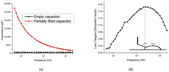 For the measurement of the real part of permittivity (ε′) and the imaginary part of permittivity (ε″), an experimental setup is shown in Figure 4. As an energy storage component, the ε′ of electrolyte stands for its storage capability and ε″ represent the loss of energy. Moreover, the loss tangent or dissipation factor was used to determine the ratio, tan δ = ε″/ε′.