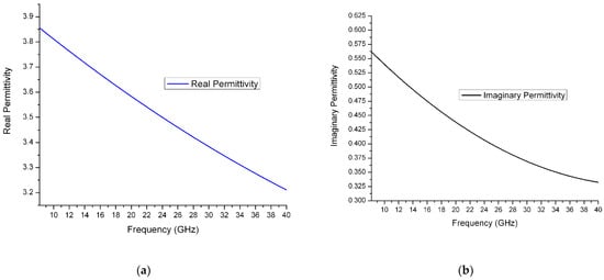 (a) Real part of relative permittivity of solid polymer electrolyte from 8.2 GHz to 40 GHz. (b) Imaginary part of relative permittivity of solid polymer electrolyte from 8.2 GHz to 40 GHz.