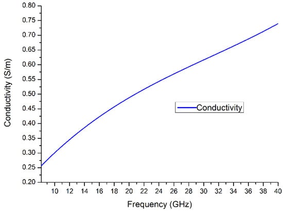 In measurements using the air-gap capacitance bridge technique, the capacitance and loss tangent spectra were derived and plotted in Figure 8a,b. The data was collected and calculated in frequency from 50 Hz to 20 kHz. In measurement using the new designed in-waveguide technique, the reflection and transmittance can be measured. After calculation using collected data, the complex permittivity and conductivity can be derived and is shown in Figure 9a,b and Figure 10, separately. The final plot is close to a linear function with frequency increasing.