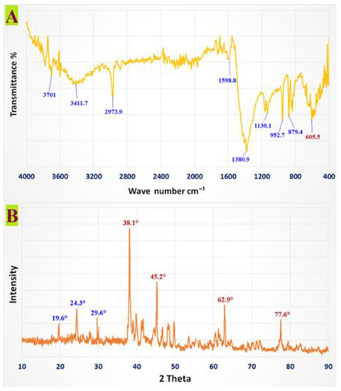 The decrease in chemical interactions and stabilizing agents, which are crucial for nanoparticle formation and stability, was confirmed via the FTIR analysis of the CMC-AgNPs. This approach is frequently used to qualitatively examine nanostructures. The Ag NPs’ FTIR spectra showed characteristic absorption at 3701 cm−1, 3411.7 cm−1, 2973.9 cm−1, 1598.8 cm−1,1380.9 cm−1, 1130.1 cm−1, 948 cm−1, 879.4 cm−1, and 605.5 cm−1, which are associated with linkage groups (Figure 1A). Furthermore, the high peaks at 3701 cm−1 and 3411.7 cm−1 correlated to -OH group stretch vibrations. It is possible to assign both symmetric and asymmetric -CH2 to the band at 2973.9 cm−1.