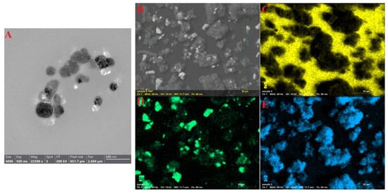 Figure 2. TEM image (A), SEM image (B), and SEM/EDX mapping analysis (CE) of CMC-AgNPs.
