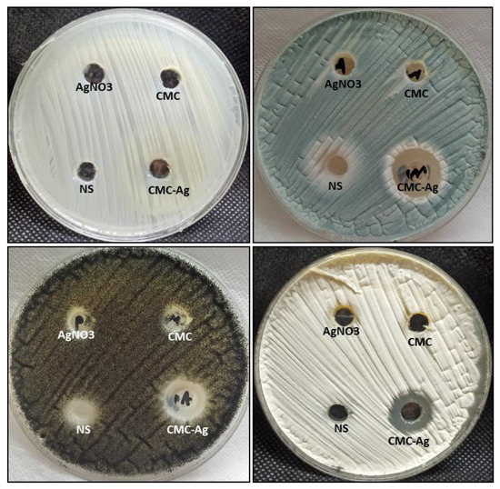 On the other hand, CMC-AgNPs had no activity on C. albicans, where it did not inhibit the growth of C. albicans. Additionally, both CMC and AgNO3 could not inhibit all tested fungal strains except A. niger only, where the inhibition zone was 9 and 8 mm, respectively. The rise in antimicrobial action is because of the stability of CMC-AgNPs in an aqueous medium since CMC keeps them from aggregating and increases the surface area of biomaterial compounds [61]. The mechanism of action of CMC-AgNPs is credited to the formation of bonds between AgNPs and COO− moieties of CMC; this leads to modifying the ability of NPs to produce and release Ag+ into aqueous dispersion, and consequently, the antimicrobial activity increases [62]. Silver ions disrupt biological membranes by invading metabolism mechanisms and damaging cell membranes by attaching to proteins and enzymes, which are key components of cells’ structural machinery, in particular to their R-SH groups [63].