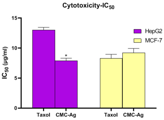 The cytotoxic effect of CMC-AgNPs was examined for two cancer cell lines, HepG2 and MCF-7 cell lines for liver and breast cancer, correspondingly. As demonstrated in Figure 4, HepG2 cells presented lesser IC50 values (7.9 ± 0.41 µg/mL) than MCF-7 cells (9.2 ± 0.73 µg/mL), suggestive of the greatest cytotoxic effect of CMC-AgNPs on hepatic cancer cells. The IC50 for taxol was 13 ± 0.44 ug/mL for HepG2 cells and 8.26 ± 0.69 ug/mL for MCF-7 cells.