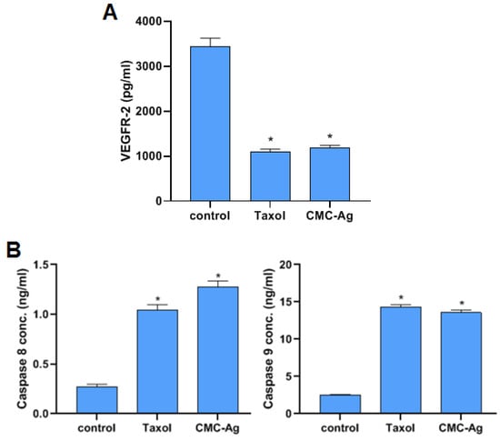 Figure 5. Effect of CMC-AgNPs on VEGFR-2 (pg/mL) in HepG2 cells compared to taxol (A); effect of CMC-AgNPs on caspase-8 and caspase-9 (ng/mL) in HepG2 cells compared to taxol (B). The results are shown as the mean ± SD. * Significantly different from the control (HepG2 cells) group at p < 0.0001.