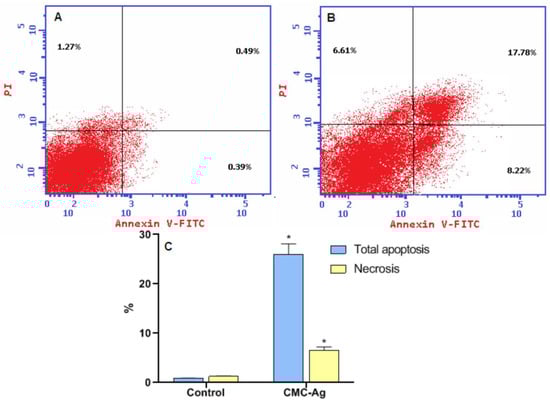 Figure 6. CMC-AgNPs induce apoptosis in the HepG2. (A) Control, (B) CMC-AgNPs, and (C) a graphical representation for % of apoptotic and necrotic cells. * Significantly different from the control group at p < 0.0001.