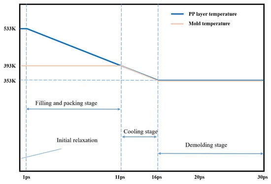 The simulations were performed using a large-scale atomic/molecular massively parallel simulator (LAMMPS), which was an open-source molecular dynamics package in a computer cluster. In the simulation, the X and Y directions were set as fixed boundary conditions, the Z direction was set as free boundary conditions. Considering that the polymer melt contacts the cavity wall and solidifies rapidly in the simulation, and the melt volume is almost negligible relative to the Ni mold insert, to simplify the simulation, the mold temperature is regarded as the temperature of the system, and the NVT ensemble is selected as the ensemble of the system in the simulation. A force of 1.0 kcal/mol Å (equal to 0.07 nN) was applied to each PMMA atom during the filling and packing process so that the polymer can fill the nano-cavity smoothly. The simulation procedure for the injection molding process included filling, packing, cooling, and the temperature of the injection molding process was set as shown in Figure 2. The PP layer was first heated to the molten state at the temperature of 513 K and relaxed for 1 ps at a constant set of particle number, volume, and temperature. In the next filling process, the mold temperature was set as 393 K to make the polymer melt temperature drop to it, and a constant particle number, volume, and energy ensemble were used to keep the total energy of the system constant. Self-heating conduction between the PP layer and the nickel mold insert was added. This is followed by the cooling stage, in which the melt and the mold are cooled down to 353 K. Next, under a demolding force of 1.0 kcal/mol Å in the opposite direction, the formed structure moved upward and finally out of the cavity. In addition, since Young’s modulus of PP is negligible compared with that of Ni, so all Ni atoms were fixed in their initial positions. In the whole simulation process, the time step, and the total step number were 0.2 fs, and 150,000, respectively.