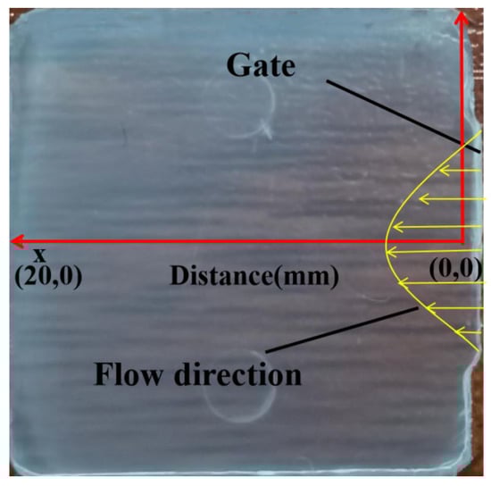 The horizontal and vertical midpoint position on the molded part is the origin, and the centerline is the horizontal axis as shown in Figure 3. Additionally, the position of the gate and flow direction is marked on the part.
