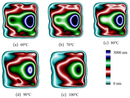 Figure 4 shows the birefringence distribution of residual stresses in the molded parts at different mold temperatures after injection molding in the experimental study. It can be seen that the overall distribution of residual stresses is axisymmetric along the centerline of the transverse axis and the further away from the gate, the smaller the stress value. Four different color stress zones are shown in the figure, corresponding to the stresses from high to low: dark blue, green, red, and light blue. The dark blue layer area has the highest stress value and forms an ellipse. By comparison, it can be clearly seen that the area of the dark blue layer and the green layer near the gate reduces with the increase in the mold temperature. When the mold temperature increases to 100 °C, the area of the dark blue layer basically disappears, while the area of the green layer on the left also disappears. Meanwhile, the outermost blue layer and the red layer keep expanding. It can be seen that the uniformity of residual stress distribution is effectively improved when the mold temperature increases.