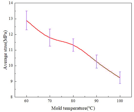 Figure 5 shows the stress variation curves along the centerline of the parts by calculation at various mold temperatures. As the mold temperature grows, the stress values of the parts decrease significantly. It can also be seen that the curves become smoother as the temperature increases and the stress concentration zone disappears at 5 mm from the origin, indicating that the uniformity of residual stresses is improved. Figure 6 shows the average stress variations at different mold temperatures. When the mold temperature increases from 60 °C to 100 °C, the average stress decreases from 12.9 MPa to 9.2 Mpa, a decrease of 28.4%. The average stresses decrease significantly when the mold temperature increases.