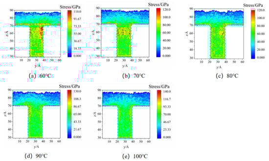 The stress distributions of nanostructures at different mold temperatures in the MD simulation are illustrated in Figure 8. It is found that the stress concentration phenomenon is particularly severe at the mold temperature of 60 °C, especially in the middle of the cavity. As the mold temperature keeps increasing, the stress concentration phenomenon begins to weaken, and the stress concentration region in the middle of the cavity gradually disappears. When the mold temperatures are 80 °C and 90 °C, respectively, the stress concentration areas are mainly distributed at the edges of the cavity. This may be the critical temperature for the formation of the condensation layer. As the temperature difference between the melt and the mold becomes larger, the thickness of the condensation layer becomes larger. When the mold temperature increases to 100 °C, the stress distribution in the cavity is relatively uniform, which is consistent with the experimentally observed phenomenon. It can be noticed that in the simulation, the stress is at the GPa level, while in the experiment it is at the MPa level. This is because the fact that microstructures are used in experiments, but nanostructures are used in the simulations. Additionally, stress is the ratio of pressure to the area, so the difference in stress values is several orders of magnitude.
