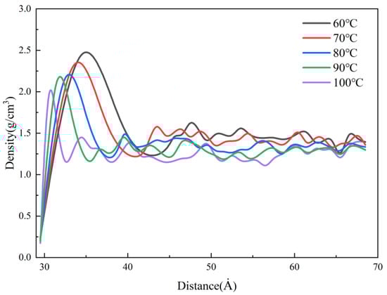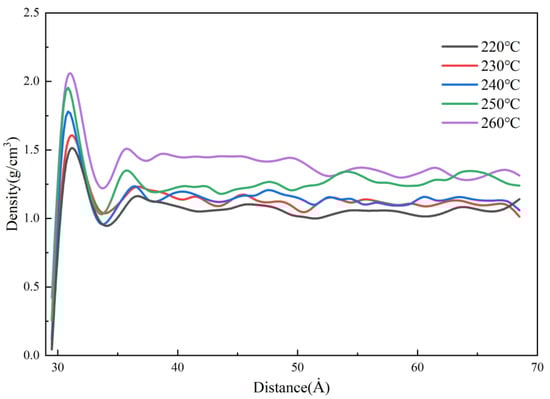 Figure 23 shows the density distributions of the melt at different melt temperatures in the MD simulation. It can be seen that the density rises sharply and reaches a peak near the cavity wall, and the peak value increases with the increase in the melt temperature. This is because as the melt temperature increases, the temperature difference with the mold is greater, the polymer shrinks more when it contacts the wall cavity, and the density increases. Additionally, the melt temperature increases the thermal motion of the molecules, which makes the flow resistance decrease. In other words, it is good for transferring the pressure to cool and solidify more of the melt, so that the maximum density can reach 2.1 g/cm3 at the melt temperature of 260 °C.