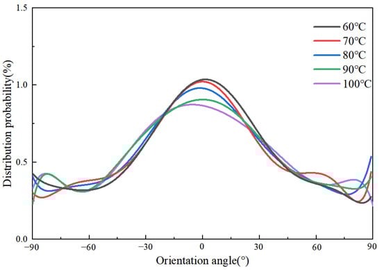 Orientation angle distributions of PP at different mold temperatures along the flow direction.