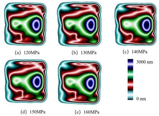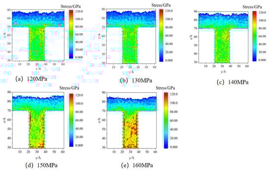 In the simulations, different pressures (1.2–1.6 kcal/mol Å) were applied to all atoms to represent the packing pressure in order to investigate the effect on residual stress formation. The stress distributions in the cavity in the MD are shown in Figure 15. The results show that the residual stresses appear first in the side walls of the cavity. As the packing pressure increases, the stress concentration zone gradually expands to the center of the cavity and fills the whole cavity at a pressure of 160 MPa.