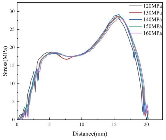 In injection molding, the packing pressure mainly plays a role in making the melt completely fill the cavity, and it has the most direct effect on the flow shear field. In the experimental study, the birefringence distribution of residual stresses in the molded parts with different packing pressures in the experimental study is shown in Figure 11. It can be found that the distribution of residual stresses remains basically constant with the increase in the packing pressure. The stresses are calculated according to Equation (1) as shown in Figure 12. The peak stress increases from 28.1 MPa to 29.3 MPa when the packing pressure increases from 120 MPa to 140 MPa, an increase of 4.2% can be seen. As the packing pressure continues to increase, the stress peak begins to decrease continuously until it drops to 29.1 MPa at a packing pressure of 160 MPa.