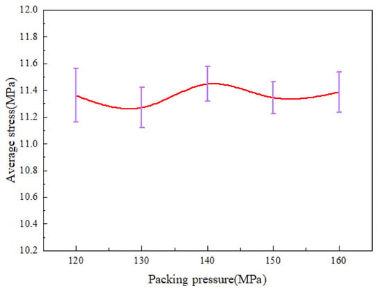 As shown in Figure 13, it can be found that the average stress changes in much are basically the same as the above. The average stress reaches the maximum at the packing pressure of 140 MPa, which is 11.45 MPa. In general, the effect of packing pressure on the residual stresses is not obvious.