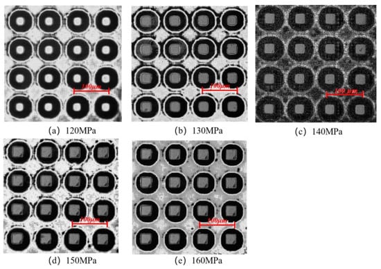 Figure 14 shows the morphologies of the micro-pillar arrays at different packing pressures in the experimental study. As the melt fills the cavity more completely with increasing packing pressure, the microstructures are also denser. In general, the degree of replication of microstructures improves with the increase in packing pressure. It can be found that the microstructures are uniform in size at a packing pressure of 130 MPa. When the packing pressure increases to 140 MPa, the microstructures become more complete, but the defects are more obvious. At the packing pressure of 150 MPa, the lower right corner of the fabricated part is warped. This is due to the fact that when the packing pressure is too high, the adhesion between the PP polymer and the Ni mold insert will be stronger, and the resistance caused by demolding will be higher. Therefore, increasing the packing pressure increases the possibility of defects.