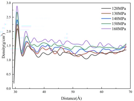 The density distributions of the cavity under different packing pressures in the MD simulation are shown in Figure 16. It can be found that the packing pressure has a significant effect on the density of nanostructures. At a packing pressure of 160 MPa, the density of the condensation layer reaches about 2.8 g/cm3. This is mainly due to the effect of the packing pressure, which makes the free volume of PP polymer continuously compressed, resulting in a gradual reduction of the intermolecular distance and a denser polymer, so the density is increasing. However, changing the packing pressure has almost no effect on the condensation layer’s thickness, which depends mainly on the cooling rate of the melt, so the effect of packing pressure on the thermal stresses is small. In the experiment, an increase in packing pressure will cause the melt to fill the cavity more completely, thereby improving the replication quality of microstructures. However, when the packing pressure is too high, the possibility of local defects increases.