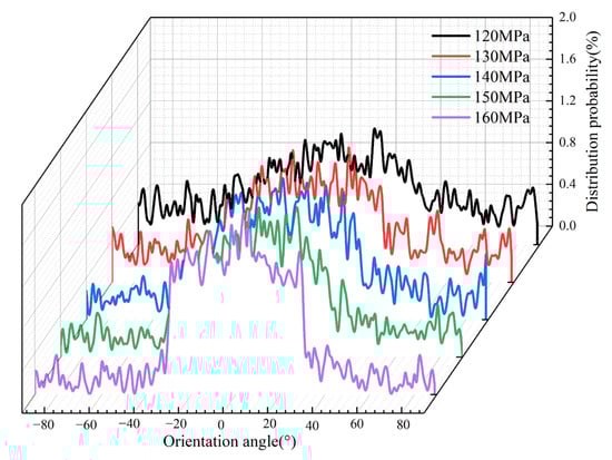 Orientation angle distributions of PP at different packing pressures along the flow direction.