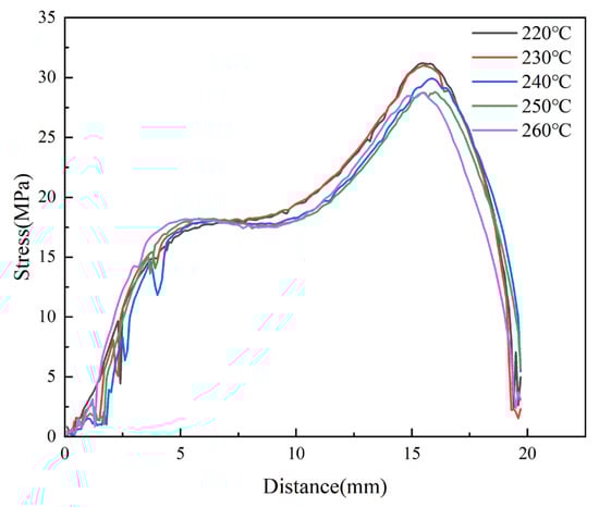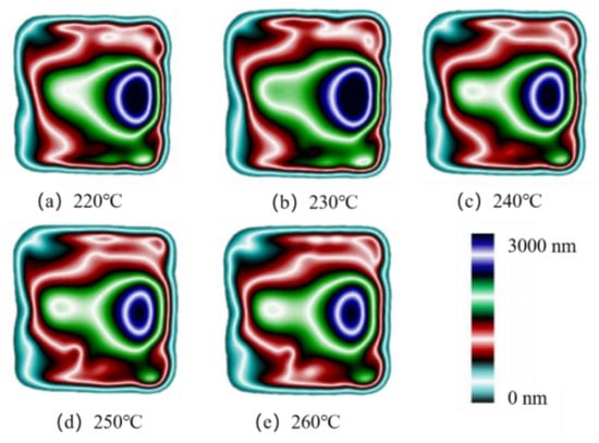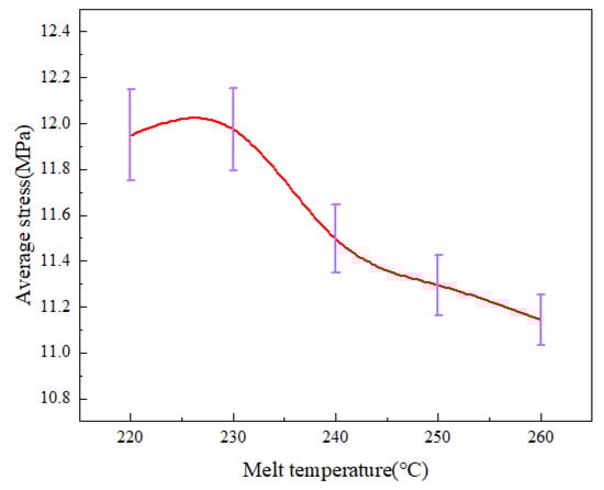 Micro-injection molding experiments were carried out at different melt temperatures. The birefringence distributions of residual stresses in PP micro-pillar arrays are shown in Figure 18. As the melt temperature increases, the ellipse of the innermost dark blue layer, which is the maximum stress layer, keeps shrinking and the area keeps decreasing. While the green layer in the lower right corner is replaced by a red layer, the outermost light blue layer is also disappearing. Intuitively, the overall residual stresses in the parts continuously decrease as the melt temperature increases. The stress variation curves are shown in Figure 19. It can be seen that as the melt temperature increases from 220 °C to 260 °C, the stress curves essentially overlap until a distance of 5 mm from the origin, where the stress peak is obtained. However, the peak stress at a distance of 15.5 mm obviously decreases from 31.2 MPa to 28.7 MPa. Figure 20 presents the graph of the average stress lines at different melt temperatures. The average stress tends to increase slightly when the melt temperature rises from 220 °C to 230 °C, while it decreases from 11.97MPa to 11.14MPa continuously when the melt temperature increases from 230 °C to 260 °C by almost 6.9%. Therefore, within a certain range, the residual stresses inside the part can be properly reduced by increasing the melt temperature.