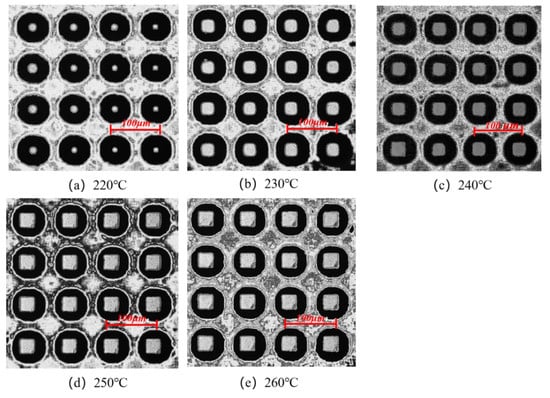 The morphologies of the micro-pillar arrays at different melt temperatures were examined in the experimental study, as shown in Figure 21. With the increase in the melt temperature, the microstructure morphology changes from a dotted profile at 220 °C to a complete profile at 260 °C. As the melt temperature increases, the molecular chain orientation ability decreases, and the stress in the microstructure before demolding is less, which will be beneficial for the demolding stage and the replication quality will be improved. Therefore, increasing the melt temperature can not only reduce the residual stresses in the micro-pillar array after demolding to some extent but also significantly improve the molding quality of micro-pillars.