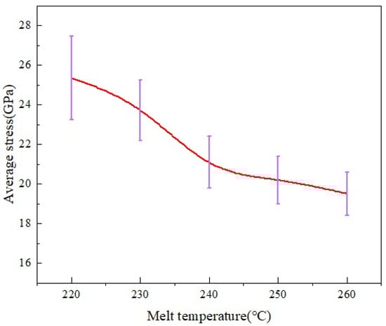 The distributions of average stress and uniformity at different melt temperatures in the MD simulation are shown in Figure 22. It can be seen that as the melt temperature increases, the overall average stress of PP shows a decreasing trend. When the melt temperature is increased from 220 °C to 260 °C, the average stress decreases by 23% and the standard deviation also decreases, indicating that the uniformity of stress distribution also improves.