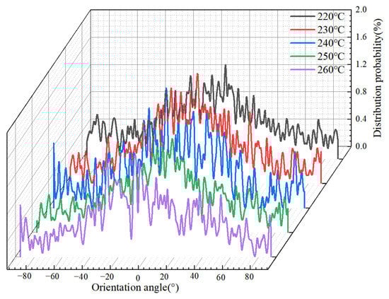 Orientation angle distributions of PP at different melt temperatures along the flow direction.