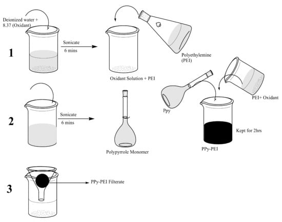 Based on the mole ratio of the oxidant to the monomer, the necessary amount of oxidant was thoroughly dissolved in deionized water using sonication for five minutes. Following that, the oxidant solution was combined with PPy solutions containing PEI and slowly shaken for three hours at room temperature. A shift in the dye of the solution from light green to black showed the growth of the products (PPy-PEI). The mixture’s black substance was filtered, washed several times with deionized water, and then dried for 24 h at 65 °C to remove extra reactants. As shown in Figure 2, the polymer product was ground into a fine powder using a mortar and pestle before being sieved using a No. 120 US Standard Sieve to create a fine powder.