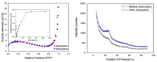 (a) N2 gas adsorption/desorption isotherms of PPy-PEI (b) X-ray diffraction of PPy-PEI before and after the adsorption process.