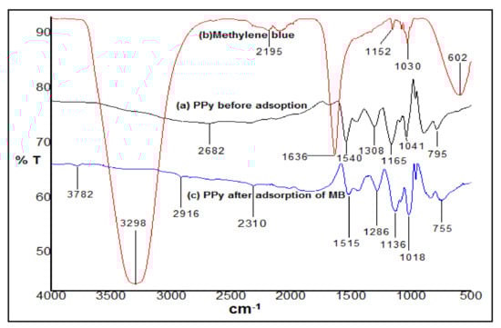 The ATR-FTIR spectra of (a) PPy fine powder prior to adsorption, (b) methylene blue, and (c) PPy following MB adsorption are shown in Figure 4. The usual PPy characteristic peaks before adsorption include the bands at 795 cm−1, 1041 cm−1, 1165 cm−1, 1308 cm−1, 1540 cm−1, and 2682 cm−1 [41]. A noticeable broad peak at 3298 cm−1 in 4b revealed the existence of OH and NH2 groups of methylene blue, whereas the acute peak at 1636 cm−1 was attributed to the unique aromatic rings. In the FTIR of methylene blue treated PPy (after adsorption) in Figure 4c, the enormous PPy peak at 2682 cm−1 (before adsorption) disappeared, and a few tiny peaks emerged at 2916 cm−1 and 2310 cm−1 in its place. Figure 4a shows that the bands at 1540 cm−1 attributable to C-N pyrrole ring straightening (before adsorption) shifted significantly to 1515 cm−1 after methylene blue adsorption [47] After methylene blue adsorption, the bands at 1308 cm−1 owing to C-N in-plane deformation and 1041 cm−1 due to N-H wagging migrated to 1286 cm−1 and 1018 cm−1, respectively.