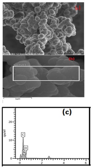 Field emission scanning microscopy was used to analyze the morphology of polypyrrole-polyethylimine nano-adsorbent. The FESEM pictures revealed that PPy-PEI was successfully synthesized; it possesses tumor-like or cauli-like characteristics. Figure 5a depicts a micrograph of the polypyrrole-polyethyleneimine powder formed before adsorption with methylene blue, demonstrating that it was uniformly distributed over the polypyrrole surface, while Figure 5b shows the energy dispersion X-ray analysis of prepared PPy-PEI nano-adsorbent at 10 µm. Figure 5c, shows the graph of an EDX elemental analysis of the prepared nano-adsorbent. [48]. Because PPy-PEI has less aggregate formation, its adsorption to methylene blue is stronger, as is the fine powder’s small nano size [49]. Using the program “image J,” the average particle size was calculated by selecting a picture with a resolution of 2.0 µm. Figure 5 shows PPy-PEI average particle sizes ranging from 25 to 60 nm, with an average maximum particle size distribution of 35–40 nm [46,50].