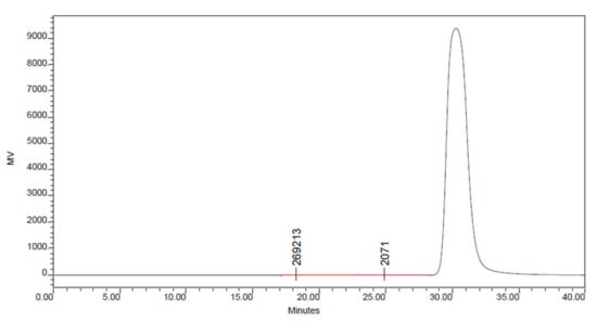 Gel permeation chromatography (GPC) was used to measure the molecular weight and molecular weight averages of the polymer as shown in Figure 8. (Water 2414 Refractive Index Detector) [51]. The total weight of the polymer was divided by the total mass number of molecules present, i.e., (Mn), and 1595 and 1578 were discovered for PPy-PEI, respectively. The average molecular weight (Mw) of PPy-PEI was 1934. The polydispersity index (PDI) for PPy-PEI was 1.21, suggesting that the polymer sample had a more evenly distributed dispersion of polymer chains.