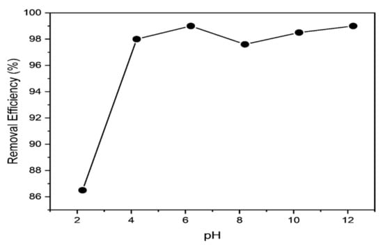 One important factor that affects the adsorption process and provides important details regarding the adsorption mechanism is the initial pH of the adsorptive solution. Initial pH regulates (1) the dye’s charge by controlling the protonation/dissociation of the dye’s functional groups, (2) the adsorbent’s surface charge by managing the protonation/dissociation of the surface functional groups, and (3) the speciation degree of hydration of heavy metals. Because the adsorption process is initially pH dependent, electrostatic interactions and/or complexation processes must be present. Since it can impact the dye adsorption process by altering the surface charge of both the polypyrrole-polyethylimine and the methylene blue dye’s ionization workouts, the initial (underlying) pH plays a vital effect during the whole adsorption period. Figure 10 shows how beginning pH affects methylene blue adsorption on the PPy-PEI adsorbent. Because protons compete with dye particles for available adsorption sites, pH 2.2 caused PPy-PEI to have a reduced expulsion rate (86.4%). The amount of disposal increased significantly as the pH decreased, reaching its peak (100%) at pH 6.2. methylene blue elimination increased once again at a pH of 12.2, most likely because of MB cation precipitation. The methylene blue adsorption PPy-PEI adsorbent movement revealed a harmonic pH of 6.2 for optimal adsorption. methylene blue adsorption using natural palygorskite and polydopamine microspheres yielded similar results [54,55].