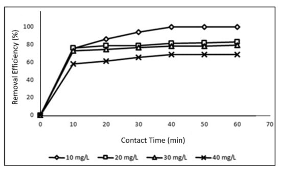 where m is the arrangement’s capacity in liters and V is the mass of the adsorbent in grams. In 10-min augmentations, the influence of contact time (from 0 to an hour) on MB adsorption was focused while all other parameters were maintained constant. Different initial MB fixations (10–40 ppm) were applied at different temperatures (20, 40, and 60 °C) at a range of adsorbent focuses, pH, and contact lengths in order to study the effects of temperature on MB adsorption.