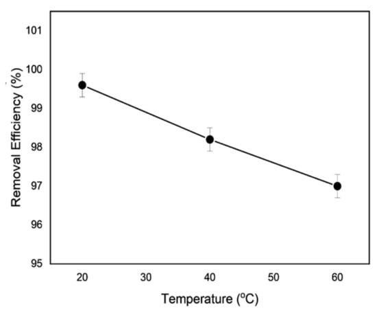 The effect of temperature on the adsorption of the adsorbent cycles was studied, as shown in Figure 12, by changing the arrangement temperature from 20 to 60 degrees Celsius. Adsorption productivity decreased with temperature, perhaps as a result of reduced surface mobility, proving that the methylene blue time of adsorption on the adsorbent polypyrrole-polyethyleneimine is exothermic. When employing other adsorbents, several studies found comparable methylene blue adsorption behavior. They linked the shorter sorption cycle to diminishing interactions between the methylene blue and the adsorbent in an advanced heat environment [57,58]. Figure 13 also illustrates how methylene blue adsorption occurred at 5-min intervals.