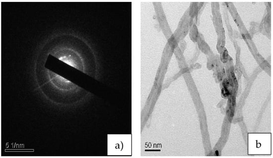 The polyethylene-terephthalate-glycol-modified (PETG) pellets were a polyester-based material provided by Nexgen Plasstek (Iyava-Sanand, Ahmedabad, Gujarat, India). The PETG pellets had a diameter of roughly about 2 ± 0.05 mm. MWCNTs were functionalized as detailed by Dalai et al. [17]. Selected area diffraction (SAD) of the functionalized MWCNTs is shown in Figure 1a. The ring structure indicates the semi-crystalline nature of the MWCNTs after chemical functionalization [18]. The randomly oriented MWCNTs are shown in Figure 1b [19,20,21]. The multi-walled carbon nanotubes were purchased from M/s NanoShel Pvt. Ltd. (Sundran, Punjab, India). The reinforcement of PETG with 0.3 wt.% MWCNTs was achieved by coating the MWCNTs through the solvent evaporation method, followed by blending and filament formation through a twin screw extruder. The obtained filament was 1.75 mm in diameter and was used as the filament for 3D printing.