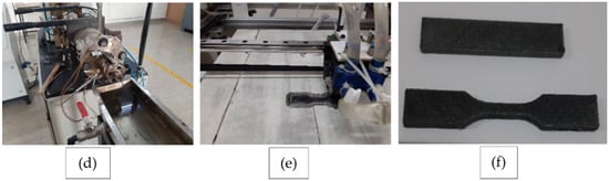 The 3D printing process was undertaken using a commercial FDM machine. Composites were characterized for their strength using a fused filament fabrication machine based on the ASTM D638 standard [23]. All the pure PETG and PETG-MWCNT samples were fabricated using the “Pramaan Platinum SFFF machine” (Additive manufacturing India Pvt. Ltd., Bengaluru, India). For proper adherence, the construction platform was wrapped with painter’s tape (2093EL tape Scotch Blue, 3M). The individual thickness of the layer was set to 0.3 mm with an infill density of 100% for the 3D structure. A 220 °C to 265 °C extrusion temperature and a 60 °C bed temperature were used to print the PETG-MWCNT filament substrate. Figure 2a–c below show the pure PETG sample, and Figure 2d shows the filament being extruded through the twin screw extruder machine; Figure 2e,f show the tensile specimen during printing and the final printed tensile sample.