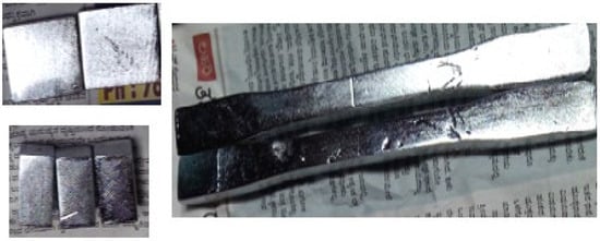 After copper deposition on the PETG+MWCNT specimens, the specimens were dipped in a nickel bath to make the plastic surface conductive. In most applications, nickel is the metal of choice. However, because copper is less resistant to scorching, it is occasionally used in automobile parts, but proper reinforcement of MWCNTs in PETG followed by a nickel bath can be a useful choice for prosthetic-limb-related applications. The electroless plating of copper and nickel deposition thickness on the specimen surface after 4 h, 8 h, 16, and 24 h were approximately 26 μm, 32 μm, 54 μm, and 88 μm, respectively. The final nickel-plated PETG+MWCNT specimens are shown in Figure 5.