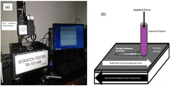 The adhesive strength between the coated layer and PETG/PETG-MWCNT substrate determines the effectiveness of the electroplating. The scratch depth and the mechanism involved and the scratch friction coefficient are important parameters to assess the coating’s adhesive strength. The parameters used for performing the scratch test are as given in Table 1 below, and the scratch testing machine is shown in Figure 6.