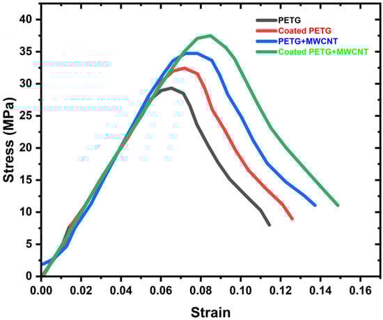 The stress–strain behavior of the PETG, coated PETG, PETG+MWCNT, and coated PETG+MWCNT samples are shown in Figure 7. The figure reveals that the curves have a linear nature up to the yield point. Later, the curves have a nonlinear nature, and the maximum stress was observed for the coated PETG+MWCNT, i.e., 37.72 MPa. The stress sequence of different PETG samples is as follows: coated PETG+MWCNT > PETG+MWCNT > coated PETG > PETG, with maximum stress values of 34.83 MPa for PETG+MWCNT, 32.12 MPa for coated PETG, and the smallest value of 28.96 MPa for pure PETG, as mentioned in the graph.