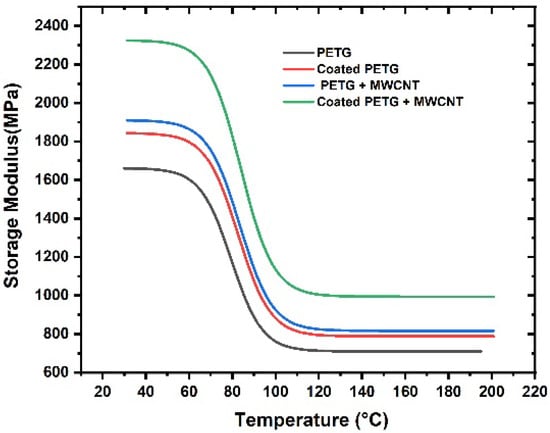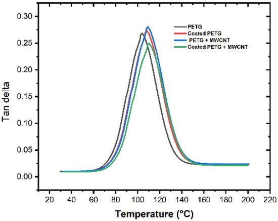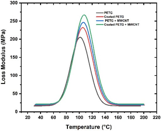 The storage modulus of all samples was observed within the temperature range of 30 °C to 200 °C, as shown in Figure 9. At a temperature of 37 °C, the storage modulus of the pure PETG substrate was 1625 MPa, which increased by 11%, 15%, and 30% for the coated PETG, PETG-MWCNT, and coated PETG-MWCNT. The highest storage modulus was observed for the coated PETG-MWCNT sample: 2300 MPa at 37 °C; it increased by 30% in comparison with the PETG sample and 19% compared with the coated PETG sample. The possible reason for the increment in the storage modulus is the good internal adhesion of Cu+Ni with the MWCNT fillers in the PETG matrix due to the uniform absorption of the metal ions in the matrix [26]. Furthermore, the strong energy storing capacity of MWCNTs during deformation due to the applied load resulted in a high storage modulus for the coated PETG-MWCNT sample [27]. Similarly, at 36 °C, the loss modulus was observed as 201 MPa for the pure PETG and further increased by 13%, 20%, and 35% for the coated PETG, PETG+MWCNT, and coated PETG+MWCNT. The highest loss modulus was observed for the coated PETG-MWCNT substrate at 270 MPa, as shown in Figure 10. This is due to the highly conductive nature of Cu and Ni, leading to the excitement of molecules, which results in the dissipation of energy due to the friction developed between the internal molecules with an increase in the temperature, as well as the rubbery nature and flow behavior of the PETG matrix with the increase in temperature, leading to a decrement in the storage and loss moduli [28]. The damping nature of the samples was studied at a temperature sweep of 30 °C to 200 °C, and it was observed that, at 30 °C, all the samples had an elastic behavior with minimal internal molecular movement, resulting in no dissipation of energy. From the graph shown in Figure 11, as the temperature increased, the tanδ increased and suddenly decreased in the temperature region of 110–120 °C, indicating more energy dissipation with increasing temperature due to high polymer chain mobility in the matrix and the high conductive nature of Cu and Ni coatings, followed by high frictional moments in the MWCNT particles with the surrounding matrix and absorbed metal ions.