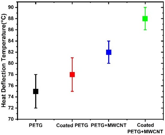 - The heat distortion temperature value increased due to the coating on the PETG-MWCNT compared to the uncoated PETG sample, showing that the material can resist high temperatures; hence, the blended PETG+MWCNT polymer with the coating can be extensively used for various applications.