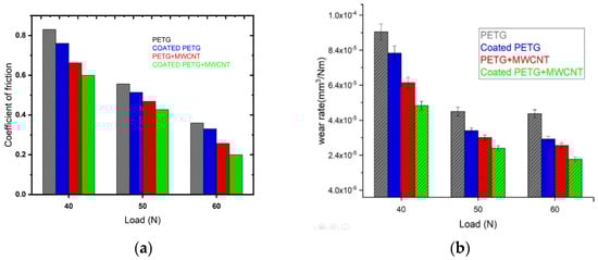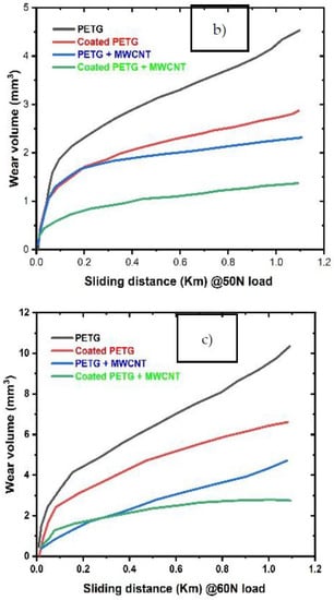 A pin-on-disc test was employed to study the wear behavior of the samples. Figure 13 shows the wear volume of all four samples, PETG, PETG+MWCNT, coated PETG, and coated PETG+MWCNT, against sliding distance. The total wear volume obtained is related to the linear wear at steady state conditions. Initially, the wear volume of the samples was high and nonlinear due to the non-flat surfaces. After achieving a flattened surface, the wear volume tended to increase with the sliding distance linearly. It was observed that the wear volume of the coated PETG-MWCNT was the lowest at all loading conditions due to an increase of the hardness with the presence of Cu and Ni particles associated with the MWCNTs, leading to a reduction of wear. From Figure 13a–c, it is observed that the PETG sample had the highest wear volume of 1.52 mm3, 4.51 mm3, and 10.9 mm3 at 40 N, 50 N, and 60 N loads and the lowest for the coated PETG-MWCNT with 0.51 mm3, 1.34 mm3, and 2.21 mm3 at the same loads. The wear rate of all the samples represents the material worn per one joule of work performed. From Figure 14a, it is observed that the wear rate of pure PETG was 9.35 × 10−5, 4.98 × 10−5, and 4.89 × 10−5 mm3/Nm at 40 N, 50 N, and 60 N loads and reduced to 4..28 × 10−5, 2.56 × 10−5, and 2.38 × 10−5 when reinforced with MWCNTs and coated; this is due to the strong interfacial adhesion between the MWCNTs and surrounding particles, leading to a strong bond between the layers, resulting in an increment in the hardness and a high work to failure ratio. It was observed that the coefficient of friction decreased with an increase in the load for all the samples, as shown in Figure 14b; the coefficient of friction of the pure PETG was high at 0.82, 0.56, and 0.38, whereas, for the coated PETG-MWCNT, it was 0.6, 0.45, and 0.2.