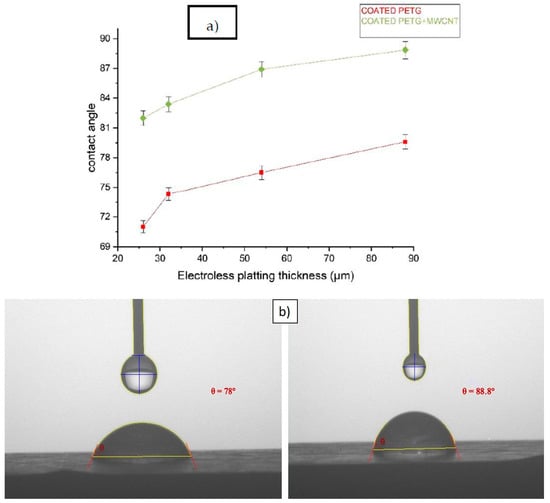 The water contact angle for the electroless plated PETG specimen was 71.2, 74.6, 76.2, and 78 degrees for the thicknesses of 26 μm, 32 μm, 54 μm, and 88 μm, and for the same electroless plated PETG-MWCNT thickness specimen, the contact angle was at 82, 83.4, 86.91, and 88.84 degrees, respectively, as shown in Figure 15a. The contact angle of the coated PETG-MWCNT specimen was high when compared with the coated PETG because of the presence of the MWCNTs associated with the PETG, which showed a positive effect, as shown in Figure 15b. It was observed that both samples had a hydrophilic nature, causing the surface to have more wettability with the presence of dominant adhesive forces. By this water contact angle test, it was evident that without MWCNTs, the water absorption on the surface of the specimen was more flattened, such that we can assume the specimen may absorb, but for the PETG-MWCNT, it showed that the water was more curved on the surface of the specimen, showing that the inclusion of MWCNTs will make the surface non-wettable, because when the contact angle increases, wettability decreases, which in turn does not affect the wear behavior of the specimens.