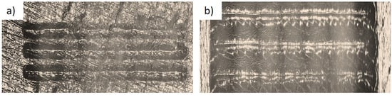 Analyzing scratch properties is essential in exploring the suitability of coatings for tribological applications. The scratch hardness, penetration of depth, and scratch coefficient of friction were studied with the load varying from 2–30 N with a scratch velocity of 1 mm/s over the coated and non-coated surfaces. The width of the scratch was measured by a microscope, as shown in Figure 16a,b, to evaluate the scratch hardness, using Equation (2).