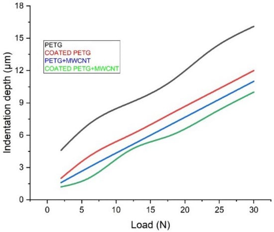 The scratch hardness values of the PETG, PETG-MWCNT, coated PETG, and coated PETG-MWCNT samples were obtained at different values of the penetration depth of the applied loads. It can be observed that the Cu-Ni-coated PETG-MWCNT contributed to an improvement in the hardness, as it opposed the displacement of the indenter and prevented deformation when compared with other samples [31]. From the results, it is noted that the scratch hardness of the PETG, coated PETG, PETG+MWCNT, and coated PETG+MWCNT specimens was 4.6 MPa, 6 MPa, 6.8 MPa, and 8 MPa, as shown in Figure 17 [32].